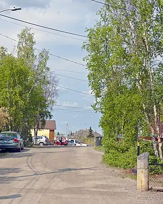 Ragged Ass Road is in a residential area midway between the intersection of Franklin (50th) Avenue, Yellowknife's main street, and School Draw Avenue, its lake shore road, and Yellowknife Bay on the north arm of Great Slave Lake.[3] The terrain is flat, at approximately 160 metres (520 ft) in elevation, reflecting the proximity of the lake.[4] The neighborhood is at the south end of the city's Old Town,[5][6] on a peninsula projecting into the lake's Yellowknife Bay.[4]