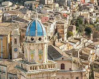 Ragusa is a hilltown that lies below the Hyblaean Mountains, and is historically divided into Ragusa Ibla and Ragusa Superiore. The municipality borders with Chiaramonte Gulfi, Comiso, Giarratana, Modica, Monterosso Almo, Rosolini (SR), Santa Croce Camerina, Scicli and Vittoria.[9] It counts the hamlets (frazioni) of Marina di Ragusa, located by the sea, and San Giacomo Bellocozzo.