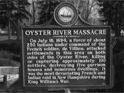 The Raid on Oyster River, also known as the Oyster River Massacre, happened during King William's War, on July 18, 1694, when a group of Abenaki and some Maliseet, directed by the French, attacked an English settlement at present-day Durham, New Hampshire.