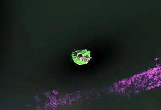 Raikoke is roughly circular, with a length of 2.5 km (1.6 mi) with a width of 2.0 kilometres (1.2 mi), and an area of 4.6 km2 (1.8 sq mi).[1] The island is a stratovolcano, its lava composed primarily of basalt.[2] The cone rises above a submarine terrace with a depth of 130 m (430 ft) to a maximum height of 551 m (1,808 ft) above sea level. The steep-walled crater is 700 m (2,300 ft) wide and 200 m (660 ft) deep with lava flows extending along the eastern half of the island. The volcano has most recently erupted in 1765, 1778, 1924 and 2019.[3] The 1778 and 1924 Raikoke eruptions were classified on the Volcanic Explosivity Index scale (that ranges from zero to eight) as VEI-4 or greater. For comparison the volcano Anak Krakatoa eruption in 2018 was also rated as a VEI-4 event.[4][5][3] The 1778 eruption of Raikoke was the largest of the recent volcanic events destroying the upper third of the island.[6] The only known fatalities from the eruptions was during the 1778 eruption when fifteen were killed from falling lava bombs.[3]