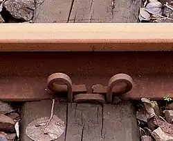 The earliest wooden rails were fixed to wooden sleepers by pegs through holes in the rail, or by nails. By the 18th century, cast iron rails had come into use, and also had holes in the rail itself to allow them to be fixed to a support.[1] 18th century developments such as the flanged rail and fish bellied rail also had holes in the rail itself; when stone block sleepers were used the nails were driven into a wooden block which had been inserted into a recess in the block. The first chair for a rail is thought to have been introduced in 1797 which attached to the rail on the vertical web via bolts.[2]