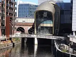 A £17.3 million southern entrance to allow for easier access from the south completed on 3 January 2016.[22][23] It widens the railway station's western footbridge and provides escalators, stairs and lifts to a partial deck over the River Aire in an iconic structure. The deck provides access to either side of the river for passengers to access Granary Wharf and Little Neville Street or Holbeck. It contains extra ticket vending machines and cycle storage. Around 20%[22] of passengers are expected to use the new entrance.[24][25]
