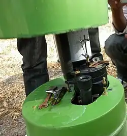 The standard United States National Weather Service rain gauge, developed at the start of the 20th century, consists of an 8 in (200 mm) funnel emptying into a metal graduated cylinder,[17] 2.525 in (64.1 mm) in diameter, which fits inside a larger container that is 8 in (200 mm) in diameter and 20 in (510 mm) tall. If the rainwater overflows the graduated inner cylinder, then the larger outer container will catch it. When measurements are taken, then the height of the water in the small graduated cylinder is measured, and the excess overflow in the large container is carefully poured into another graduated cylinder and measured to give the total rainfall.[18] A cone meter is sometimes used to prevent leakage that can result in alteration of the data. In locations using the metric system, the cylinder is usually marked in mm and will measure up to 250 mm (9.8 in) of rainfall.