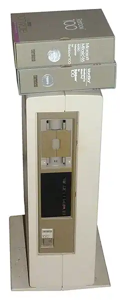 The Rainbow 100 is a microcomputer introduced by Digital Equipment Corporation (DEC) in 1982. This desktop unit had a monitor similar to the VT220 and a dual-CPU box with both 4 MHz Zilog Z80 and 4.81 MHz Intel 8088 CPUs. The Rainbow 100 was a triple-use machine: VT100 mode (industry standard terminal for interacting with DEC's own VAX), 8-bit CP/M mode (using the Z80), and CP/M-86 or MS-DOS mode using the 8088.[1][2] It ultimately failed to succeed in the marketplace which became dominated by the simpler IBM PC and its clones which established the industry standard as compatibility with CP/M became less important than IBM PC compatibility. Writer David Ahl called it a disastrous foray into the personal computer market. [3] The Rainbow was launched along with the similarly packaged DEC Professional and DECmate II which were also not successful. The failure of DEC to gain a significant foothold in the high-volume PC market would be the beginning of the end of the computer hardware industry in New England, as nearly all computer companies located there were focused on minicomputers for large organizations, from DEC to Data General, Wang, Prime, Computervision, Honeywell, and Symbolics Inc..