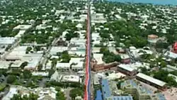 In 2003, Baker was again commissioned to produce a giant flag marking the 25th anniversary of the flag itself.[112] Dubbed "25 Rainbow Sea to Sea", the project entailed Baker again working with teams of volunteers but this flag utilized the original eight colors and measured one and a quarter miles (2 km) across Key West, Florida, from the Atlantic Ocean to the Gulf of Mexico.[113][114] The flag was again divided afterwards and sections were sent to over a hundred cities worldwide.[115]