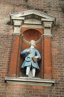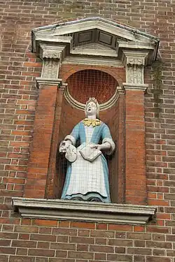 Two of the window openings on the second floor have pedimented niches. Those niches were originally occupied by two contemporary figures of a boy and a girl, but they and other original objects from the school were moved when the school moved, and they are still preserved.[1] The niches are now filled by replicas.[2]
