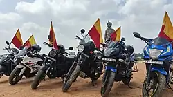 Rajyotsava Day is celebrated with great joy and vigour all over Karnataka. The entire state wears a festive look on this day as the red and yellow Kannada flags are hoisted at different strategic locations across the state and the Kannada anthem ("Jaya Bharatha Jananiya Tanujate") is chanted.[9] The flag is hoisted at political party offices and several localities even as youth in many areas take out processions on their vehicles.[10] Religion not being a factor, the Rajyotsava is celebrated by Hindus, Muslims,[11] and Christians as well.[12][13]