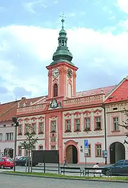 In the second half of the 16th century, the town was rapidly developing. Town walls with town gates were built, the Church of Holy Trinity with a cemetery was established, and the beer brewing prospered and became known in whole kingdom. In the 17th century, the town suffered from Thirty Years' War, plague and floods, which depopulated the town.[3]