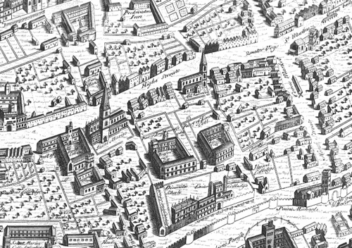 Agas is perhaps principally remembered for Oxonia Antiqua Restaurata, a detailed plan – really a "bird's-flight view" – of Oxford.[10] It was drawn in 1578 and engraved and printed in 1588: a copy is held in the Bodleian Library, bequeathed by Richard Rawlinson. The plan was re-engraved by Robert Whittlesey in 1728, at the expense of the university, but this plate was destroyed in the fire at John Nichol's printing-works in 1808.[11]