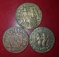 A popular silver token, found at Ayodhya and other pilgrimage centres of north India, features images of Rama and Lakshmana with a legend on the obverse, and depicts Rama's coronation on the reverse side.[5] On the obverse, Rama and Lakshmana are depicted wearing a dhoti, both wearing crowns, and holding a bow on their left arms. Rama is shown with a trident in his right hand. The legend surrounding them reads Rāma Lachamana Jānaka java(ya)ta Hanamānaka ("Victorious are Rama, Lakshmana, Sita, and Hanuman"). The tokens also bear a date that reads 17 śana 40, which probably means Vikrama Samvat year 1740, that is, 1683 CE. On the reverse, Rama and Sita are shown on a throne, under a chhatra. They are flanked by Lakshmana on right, Bharata and Shatrughna at the left, and Hanuman at bottom.[6] A variant of this token shows tridents in the right hands of both Rama and Lakshmana, and bears the date 517-40, which may refer to the year 51740 of a fictitious calendar era.[7]