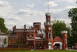 In 1879 Tsar Alexander II gave the estate of Ramon to his niece Princess Eugenia and the Duke of Oldenburg as a wedding gift. In 1883 they commissioned construction of the palace, in red brick, in the style of an English Gothic castle with gatehouse. The architect is usually said to have been Christopher Neysler,[1][2] but some sources attribute the design to Nicholas Benois.[3] The building used "foot bricks" manufactured according to a traditional process involving peasants treading the clay into wood frames for firing.[3]