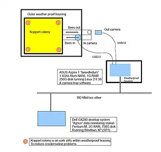Here we see a typical Rana setup for observing bumblebees in the vicinity of their colony. The colony is mounted on cork stilts inside an outer (plastic) weatherproof housing. Bees are channelled in and out of the nest via a one way system. Each channel is monitored using a Phillips SPC1330N autofocus USB camera which are connected to the Asus Aspire one data logging computer via USB 2.0 connections. This logging computer runs C code which implements a motion detector which is loosely modelled on the frog visual system (e.g. a blob detector which capable of detecting and tracking blobs of a user determined size). This motion code is running on top of a Linux kernel. This offers a relatively good real time performance on the relatively slow Atom N450 processor which was chosen to keep power consumption low (so the logger can operate stand-alone with solar panels in remote field locations). The data logger is connected to the outside world via 100 Mbit/second Ethernet (Wi-Fi and a mobile phone dongle could be substituted in remote field locations). The system is controlled via a web interface on a remote monitoring computer, smart phone or tablet. With high end cameras like the Phillips SPC1330N or the Logitech C270 it is possible to point and focus the cameras from the monitoring station too.
