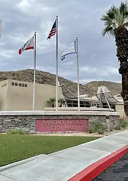 Rancho Mirage is a city in Riverside County, California, United States. The city is a low-density desert community with resorts, golf courses, and country clubs within the Colorado Desert section of the Sonoran Desert.[5][6] Nestled along the foothills of the Santa Rosa Mountains in the south, it is located several minutes east of Palm Springs. The city is adjacent to Cathedral City, Palm Desert, and unincorporated Thousand Palms.[7][8] The population was 16,999 at the 2020 census, down from 17,218 at the 2010 census, though the seasonal population can exceed 20,000. Incorporated in 1973, Rancho Mirage is one of the nine cities of the Coachella Valley.[9]