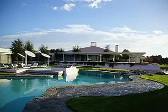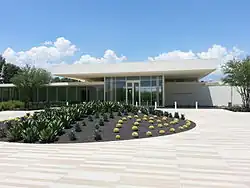 Some of the first places of accommodation to be established were the White Sun Guest Ranch and Wonder Palms Ranch, and later Desert Air Hotel and Thunderbird Ranch in the 1940s. The 320-acre Desert Air Hotel was purchased by the Rancho Las Palmas Country Club in the 1970s.[22] Rancho Las Palmas has Spanish architecture consisting of wood walls, Saltillo tiles, and high ceilings. The resort, which is the city's third-largest employer, is located on a 249-acre property in the center of Rancho Mirage, across Bob Hope Drive from The River, an outdoor shopping center. It has a 27-hole golf course.[23]