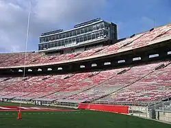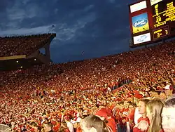 In 2018, a plan was announced to build premium seating in the south end zone (replacing existing bleacher seating), replace the artificial turf, upgrade utilities, and improve the press box. These projects were completed over the summer of 2022, cutting the stadium's capacity from 80,321 down to its current number of 75,822.[16] With the 2024 expansion of the Big Ten and its new television contract adding new evening games to the schedule deep into November, and the possibility of hosting College Football Playoff games, UW–Madison replaced the field after the 2023 season with a heated surface and winterization measures which will allow it to continue hosting games until the end of the year. The scoreboard will also have additional panels added on to replace traditional static advertising hoardings.[17]