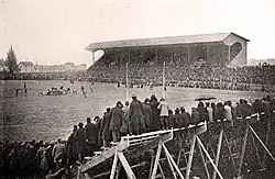After an outcry from veterans over plans to turn the site into building lots, the state bought it in 1893 and presented it to the university. Soon afterward, it was pressed into service as an athletic ground. It was originally used by the track and field team before the football and baseball teams moved there in 1895. The wooden bleachers were very difficult to maintain, and some were condemned as unsafe in 1914. The university then asked for $40,000 to build a concrete-and-steel stadium, and got $20,000. After three sections of bleachers collapsed during a 1915 game, the state readily granted the additional money. The new stadium opened for the first time on October 6, 1917. It consisted of 7,500 concrete seats—roughly corresponding to the lower portion of the current stadium's east grandstand—and 3,000 wooden seats from the old field.