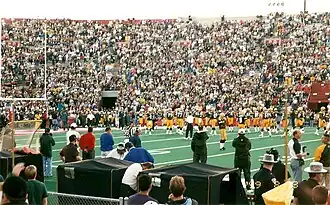 On October 30, 1993, Wisconsin defeated the Michigan Wolverines, 13–10, for the first time since 1981. As the final gun sounded, students began to charge the field to celebrate, but were blocked by the guardrails surrounding the field. The crowd in the back, not aware of what was going on at the front, continued to move forward, aided by gravity. Those in front were crushed against the rails and then trampled when the rails finally gave way and the throng spilled onto the field.[18] There were no fatalities, but 73 students were injured, six of them critically.[19] Several Badgers football players assisted with removing the injured from the tangle. Per Mar Security (stadium security) and the University of Wisconsin were later found liable for this situation.[20]