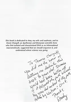 Copy of Dedication page to Plant Cell Biology sent to Thomas Chargaff, son of Erwin Chargaff