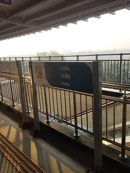 Ranip is an elevated metro station on the North-South Corridor of the Red Line of Ahmedabad Metro in Ahmedabad, India.[1] Around this metro station holds the main DMart SuperMarket along with Ahmedabad Municipal Swimming Complex and Ahmedabad BRTS Workshop and Depot. This phase of the metro system was inaugurated on 30 September 2022 by Prime Minister Narendra Modi and was opened to the public on 6 October 2022.[2][3][4][5]