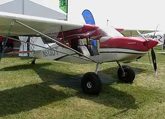 The aircraft features a strut-braced high-wing, a two-seats-in-side-by-side configuration enclosed cockpit accessed via bowed-out top-hinged doors to give increased shoulder room, fixed conventional landing gear or optionally tricycle landing gear made from 7075 aluminum with wheel pants and a single engine in tractor configuration.[1][2][4]