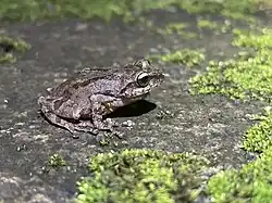 The adult male frog measures 15–45 mm long in snout-vent length. The skin of the dorsum is light brown with darker brown spots and marks. There is a dark brown stripe on each side of its head. The stripe goes from the eye over the ear to the frog's shoulder. The pupil of the eye is black in color with gold in it.[3]