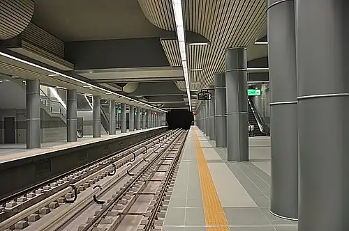 The construction of the section from Mladost I to Business Park Sofia station (2.62 kilometres (1.63 mi), with three new underground stations) began on 25 April 2013, and was completed on 8 May 2015.[7][13] It cost BGN 85,767,683 (EUR 43,852,320), VAT exclusive, and serves the majority of the second most densely populated area in Sofia.[14][15] Part of the sections of "Sofia Airport" - "Iskarsko Shose" and, Ovcha kupel" -, Krasno selo" are not underground.