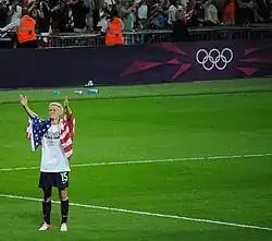 Rapinoe is internationally known for her crafty style of play and her activism off the pitch.[7][8][9] Her precise cross to Abby Wambach in the 122nd minute of the 2011 FIFA Women's World Cup quarterfinal match against Brazil resulted in an equalizer and eventual win for the Americans after a penalty shootout. The last-minute goal received ESPN's 2011 ESPY Award for Best Play of the Year. During the 2012 London Olympics, she scored three goals and tallied a team-high four assists to lead the United States to a gold medal. She is the first player, male or female, to score a goal directly from a corner at the 2012 Olympic Games, having done so twice. She won both the Golden Boot and Golden Ball awards at the 2019 FIFA Women's World Cup in France.[10]
