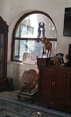 The twelve bedroom guesthouse is a grandiose two-storey building with "huge archways", "ornate carvings", "frilly balconies", and "sweeping courtyards", with a deliberate aging of the exterior "monsoon-blackened" walls that show the centuries.[1][5] The second floor "roof" bedrooms have a courtyard in the center.[6]