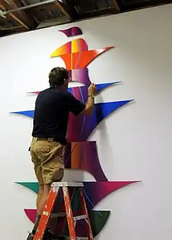 Using acrylic paint and wood—and sometimes Plexiglas and UV light—Burggraf frequently calls his paintings "color constructions",[4][5] and they have been exhibited in the United States, Sweden, and Korea.[6][7][8][9]