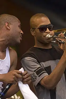 ![]() Three members of the Rebirth Brass Band and other musicians play for a second-line parade in the Central Business District of New Orleans in 2007. | |