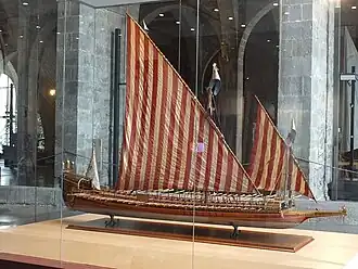 Bow view of the replica in the Museu Marítim de Barcelona. -
