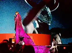 The tour's main stage was elevated and set up at the end of each arena. A long catwalk extended from the middle into the audience ending in a heart-shaped stage. The catwalk was bisected by an arena-wide cross stage.[144] Designers working on the tour's wardrobe included: Jeremy Scott for Moschino, Alessandro Michele for Gucci and Alexander Wang, along with Fausto Puglisi, Prada, Miu Miu, Swarovski, Lebanese designer Nicolas Jebran, as well as Madonna's longtime collaborator Arianne Phillips.[145] The tour generated positive critical reviews, many noting that Madonna appeared to be in a happy mood onstage.[146][147] It grossed a total of $169.8 million from 82 shows, with over 1.045 million ticket sales.[148] A live album of the tour was released on September 15, 2017, as DVD, Blu-ray and digital download.[149]
