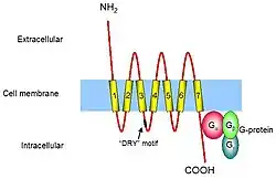 Typical structure of a chemokine receptor, with seven transmembrane helices and a characteristic "DRY" motif