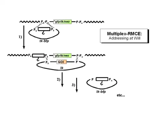 - ^ Turan, S.; Kuehle, J.; Schambach, A.; Baum, C.; Bode, J. (2010). "Multiplexing RMCE: Versatile Extensions of the Flp-Recombinase-Mediated Cassette-Exchange Technology". J. Mol. Biol. 402 (1): 52–69. doi:10.1016/j.jmb.2010.07.015. PMID 20650281.