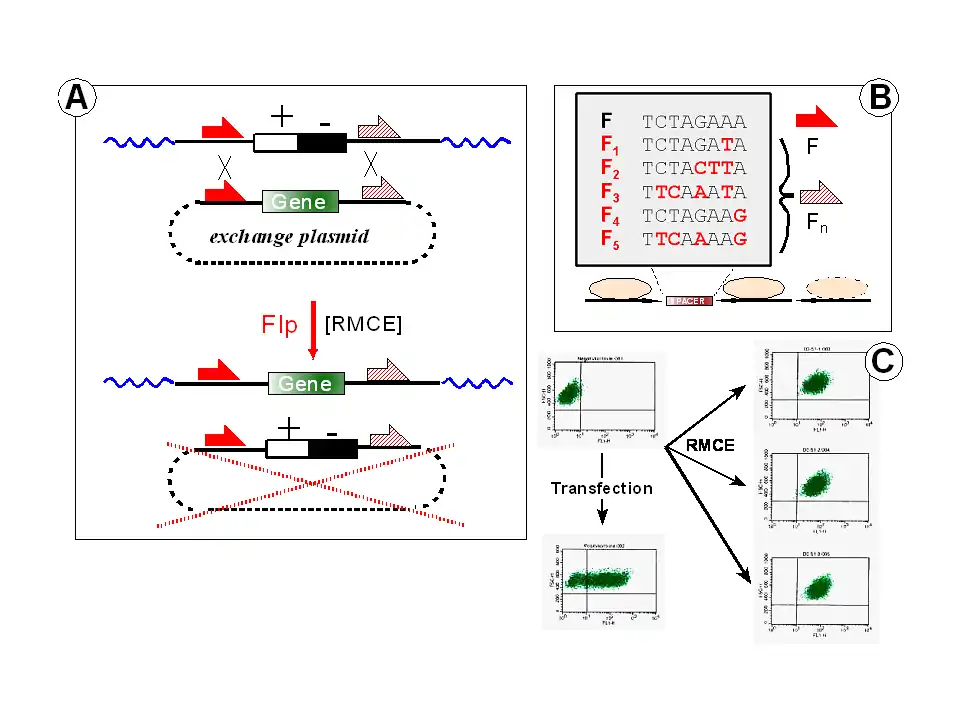 The genetic modification of mammalian cells is a standard procedure for the production of correctly modified proteins with pharmaceutical relevance. To be successful, the transfer and expression of the transgene has to be highly efficient and should have a largely predictable outcome. Current developments in the field of gene therapy are based on the same principles. Traditional procedures used for transfer of GOIs are not sufficiently reliable, mostly because the relevant epigenetic influences have not been sufficiently explored: transgenes integrate into chromosomes with low efficiency and at loci that provide only sub-optimal conditions for their expression. As a consequence the newly introduced information may not be realized (expressed), the gene(s) may be lost and/or re-insert and they may render the target cells in unstable state. It is exactly this point where RMCE enters the field. The procedure was introduced in 1994 [1] and it uses the tools yeasts and bacteriophages[2] have evolved for the efficient replication of important genetic information:
