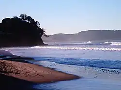 The beach is on the Hauraki Gulf and the suburb is bounded by two estuaries, that of the Weiti River to the south and the Ōrewa River to the north. The beach is named for its reddish colour.[3] The sand is light brownish-grey in colour and its "red" colour is due to fragments of dark orange-brown, iron-stained, fossil shell. The majority of the iron-stained shells consists of highly fragmented bivalve shells, which are less than 2 cm (0.79 in) across.[3][4]