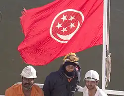 According to the Parliamentary paper Misc. 5 of 1966, the background of the ensign is red with the ratio of its width to its length being one by two. In contrast, the ratio of the national flag of Singapore is two by three.[2] In the centre of the ensign is a white ring, which surrounds a crescent and five stars also coloured white. The five stars are arranged such that they form a pentagon in the middle. The crescent and stars are taken from the national flag, although in the ensign the crescent appears underneath rather than to the left of the stars, similar to the national coat of arms. According to a 1999 circular National Colours for Singapore Ships issued by the Maritime and Port Authority of Singapore (MPA), the red colour of the civil ensign is the same as that of the national flag.[3] The shade of red has been defined by the Ministry of Information, Communications and the Arts as Pantone 032.[2]