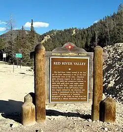 The town of Red River had its beginnings late in the 19th century, when miners from nearby Elizabethtown in the Moreno Valley were drawn in by gold strikes in the area and trappers sought game. It was named after the perennial stream, Red River, that flows through the town, coming from the northern slopes of Wheeler Peak. By 1895, Red River was a booming mining camp, with gold, silver and copper in some abundance, and a population estimated at three thousand. Mining hit its peak in 1897, and by 1905 the mining and the population dwindled but the town survived, gaining a reputation as a great getaway from hot weather and as a trout fishing paradise. The last serious mining efforts extended until 1931. By that time tourism had become the principal economic livelihood.[4]