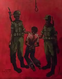Thousands of men and women were rounded up and executed in the following two years.[11][6] Amnesty International estimates that the death toll could be as high as 500,000.[4] Groups of people were herded into churches that were then burned down, and women were subjected to systematic rape by soldiers.[18] The Save the Children Fund reported that the victims of the Red Terror included not only adults but 1,000 or more children, mostly aged between eleven and thirteen, whose corpses were left in the streets of Addis Ababa.[9]