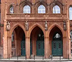 The Red Town Hall (Polish: Czerwony Ratusz; German: Rotes Rathaus), also known as the New Town Hall (Polish: Nowy Ratusz; German: Neues Rathaus), is a historic Gothic Revival town hall building in Szczecin, Poland. It is placed at 4 Stephen Báthory Square, within the New Town neighbourhood of the Downtown district. It was designed by Konrad Kruhl, and opened in 1897, as the seat of municipal government. It was burned down in 1945, and rebuilt in 1963, now housing the local maritime administration.
