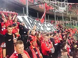 Tifozat Kuq e Zi stands firm in the political view that Albanians should share only one national team and have continuous aspirations to join in one state (Një Komb, Një Kombëtare), i.e. unification of Albania, Kosovo, etc.[75][76] In this sense, TKZ is joined by different supporters' associations throughout Albanian-speaking regions mainly in Kosovo (Shqiponjat of Peja, Kuqezinjet e Jakoves of Gjakova, Plisat of Prishtina, Torcida of Mitrovica, etc.), North Macedonia (Ballistët of Tetovë, Ilirët of Kumanovë, Shvercerat of Shkupi, etc.) and in Albania itself (Ultras Guerrils of Partizani Tirana, Tirona Fanatics of KF Tirana, Vllaznit Ultras of Vllaznia Shkodër, Ujqërit e Deborës of Skënderbeu Korçë, Shqiponjat of KF Besa Pejë and many other different Albanian fans).[73]
