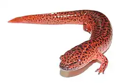 The Pseudotriton ruber is a medium-large salamander, with adults ranging from 4.3 to 7.1 in (11–18 cm) in total length. It has a relatively stout body with 16–18 coastal grooved sides.[8] Its back varies in color from an orange-brownish tint to a bright red, depending on its age. Like other salamanders, the red salamander seems to lose its color as it ages, becoming more darkly pigmented with less obscure patterns.[9] The larvae of this species have a stout head and body, are dark in coloration, lack spots, and tend to have distinct mottling or streaks.[10] Another distinguishing characteristic of P. ruber is the appearance of numerous irregular black spots down its back. Although the red salamander is brilliantly colored and has many distinguishing features, it is sometimes difficult to tell species apart. P. ruber is most similar in appearance to the mud salamander (P. montanus), but can be distinguished by the difference in size and number of spots running down the dorsum and also by the difference in the color of the iris. Both P. ruber and P. montanus have bright red colorations that have been considered examples of a Müllerian mimetic complex.[11] The red salamander has more spots and the spots also tend to be larger in size than those of the mud salamander. The spots on P. ruber are also said to overlap in many areas, whereas mud salamanders rarely, if ever, do.[12] In regard to eye color, the red salamander's iris is a gold-like tint, whereas the mud salamander's iris is brown.[5] The gold-like tint iris for the red salamander is also distinguished by its horizontal bar that runs through the iris.[13] Mud salamanders typically have a blunter snout than the red salamander.[9] Also, the mud salamanders typically have a more contrasting dorsal and ventral coloration than the red salamanders that are more uniform in color.[9]