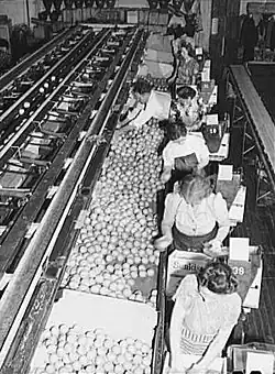In the spring of 1882, Mr. E. J. Waite of Wisconsin planted the first orange grove in the city. For almost 75 years, the city was the center of the largest navel orange-producing region in the world.[42] By the late 1930s, Redlands was a fruit-packing center surrounded by more than 15,000 acres (61 km2) of citrus groves. The city produced more than 4,200 railcars of navel oranges and 1,300 cars of Valencia oranges during the 1937–38 growing season.[43] During the 1930s and 1940s, labor activists campaigned in the canneries and packing houses for union representation and higher wages. The United Cannery, Agricultural, Packing, and Allied Workers of America (UCAPAWA) won 13 National Labor Relations Board representation elections in the Riverside-Redlands area in 1943. In 1945, the first annual Orange Queen Ball at the Redlands City Auditorium was held to raise funds for the union.[44]