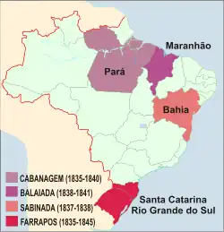Among the rebellions there were three slave revolts: the Carrancas Revolt in Minas Gerais (1833), the Malê Revolt in Salvador (1835) and the Manuel Congo revolt in Rio de Janeiro (1838).[21] In a period of nine years, rebellions broke out in almost all of Brazil, most of them resulting from the dissatisfaction of the regional elites allied with the urban middle class (made up of liberal workers such as journalists, officials and the military) who, dissatisfied with the central power in Rio de Janeiro, protested against the economic hardships, the increase of taxes and the appointment of governors without local support.[19]
