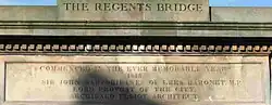 In 1813, Sir John Marjoribanks, the then Lord Provost of Edinburgh, revived a plan to build a jail on the slopes of Calton Hill.[3] In order to access this, open up the slopes of Calton Hill to development and shorten the road to East Lothian and England, he presented the plan to build Regent Bridge to the City magistrates on 1 March 1814 with a projected cost of about £20,000[3] and backed up by a feasibility study by the engineer Robert Stevenson.[4] Although complicated (part of the old Calton burial ground had to be moved, a fifty-foot valley had to be bridged, solid rock had to be blasted and buildings at the east end of Princes Street had to be demolished[2]) the project was accepted and Waterloo Place on top of the bridge was designed by Archibald Elliot.[5] Construction under the direction of Robert Stevenson began in 1816 and the bridge was finished in 1819.[1] It is a major example of Greek Revival architectural work of the time.[1] The arch is semicircular, and fifty feet (15 m) wide. At the north front it is forty-five feet (13.716 m) in height, but at the south front it is sixty-four feet two inches (19.56 m), because the ground declines to the south. The roadway is formed by a number of reverse arches on each side. The great arch is ornamented on the south and north by two ornamental triumphal open arches,[5] supported by elegant Corinthian columns. The whole property purchased to open the communication to the city by this bridge cost £52,000, and the building areas sold for the then immense sum of £35,000. The street along the bridge was called Waterloo Place, as it was laid in the year of the Battle of Waterloo. Regent Bridge was officially opened on 18 August 1819 during the visit of Prince Leopold of Saxe Coburg to Edinburgh.[1]
