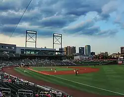 The original layout of the stadium had center field located at the northern end of the facility with the backdrop being the skyline of downtown Birmingham.[25] However, its orientation was changed in the final design with center field located at the eastern end of the facility with the backdrop being the downtown Birmingham skyline, UAB and the medical district and Red Mountain.[25] The change was made as a result of Birmingham's irregular street grid that is oriented about 30° from magnetic north in order to meet guidelines set forth by Major League Baseball for stadium orientation as it relates to sun angle.[25][26]