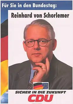 His parents were Timo Clemens Freiherr von Schorlemer (1903–1962) and Alice Elisabeth Gräfin von Merveldt Freiin zu Lembeck. Since 1955 Schorlemer has been a member of the Christian Democratic Union of Germany political party.[1] A farmer on his own land in Schlichthorst, Lower Saxony since 1965, from 1974 to 1980 Schorlemer was a member of the Landtag of Lower Saxony and was a member of the German Bundestag from 1980 to 2002.[2] He is member of the Deutsche Parlamentarische Gesellschaft (German Parliamentary Association) and the Waldbauernverband Weser/Ems.[3] From 1992 to 2000 he was president of organisation Arbeitsgemeinschaft Deutscher Waldbesitzerverbände seit 1948.[4] Schorlemer is married with Monika Gatzen (born 1945) and has five children.