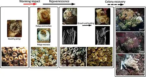 Rejuvenescence represents the ability of corals to adapt and persist in the face of environmental stressors, providing hope for their resilience in the context of climate change.[1] This survival mechanism, previously known only in extinct fossil corals, has now been documented in living corals in the Mediterranean Sea, specifically Cladocora caespitosa.[1][2] A study published in 2019 gives insight on the significance of rejuvenescence and its potential implications for the long-term survival of coral reefs.[1][2]