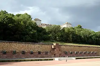 After the war Renée Lévy's remains were returned to France and buried at Fort Mont-Valérien in Suresnes during an impressive ceremony on 11 November 1945. Fifteen resistance fighters were reburied during the ceremony, including two women – Renée Lévy and Berty Albrecht.[1] The fifteen bodies, which had been kept at the Arc de Triomphe beside the grave of the Unknown Soldier, had great symbolic importance, representing the dead of the different battles. Eleven had died "facing the enemy" and four represented the martyrs of France.[4][a] The presence of Renée Levy symbolized the re-acceptance of the Jews as a part of the nation, after their exclusion during the Vichy period.[6] Of at least equal importance, she and Raymond Bigosse represented the deported resisters.[5]