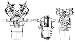 The V-12 engine had its two rows of cylinders angled at 60 degree to each other and had a cylinder bore of 96 mm and a stroke of 140 mm. The cylinders and cylinder heads were separate cast-iron pieces with cast fins for air-cooling. The cylinder head was tightened to the cylinder with a copper-asbestos washer, and then secured by a cross-shaped clamp which was bolted to the crankcase with four long studs.[2] Airflow for cooling the cylinders was generated with a fan driven from the rear end of the crankshaft. The fan was blowing air into the sheet metal enclosed chamber between the two rows of cylinders, which then left the enclosure through the narrow spaces between the cylinders, passing through the cylinder's cooling-fins.